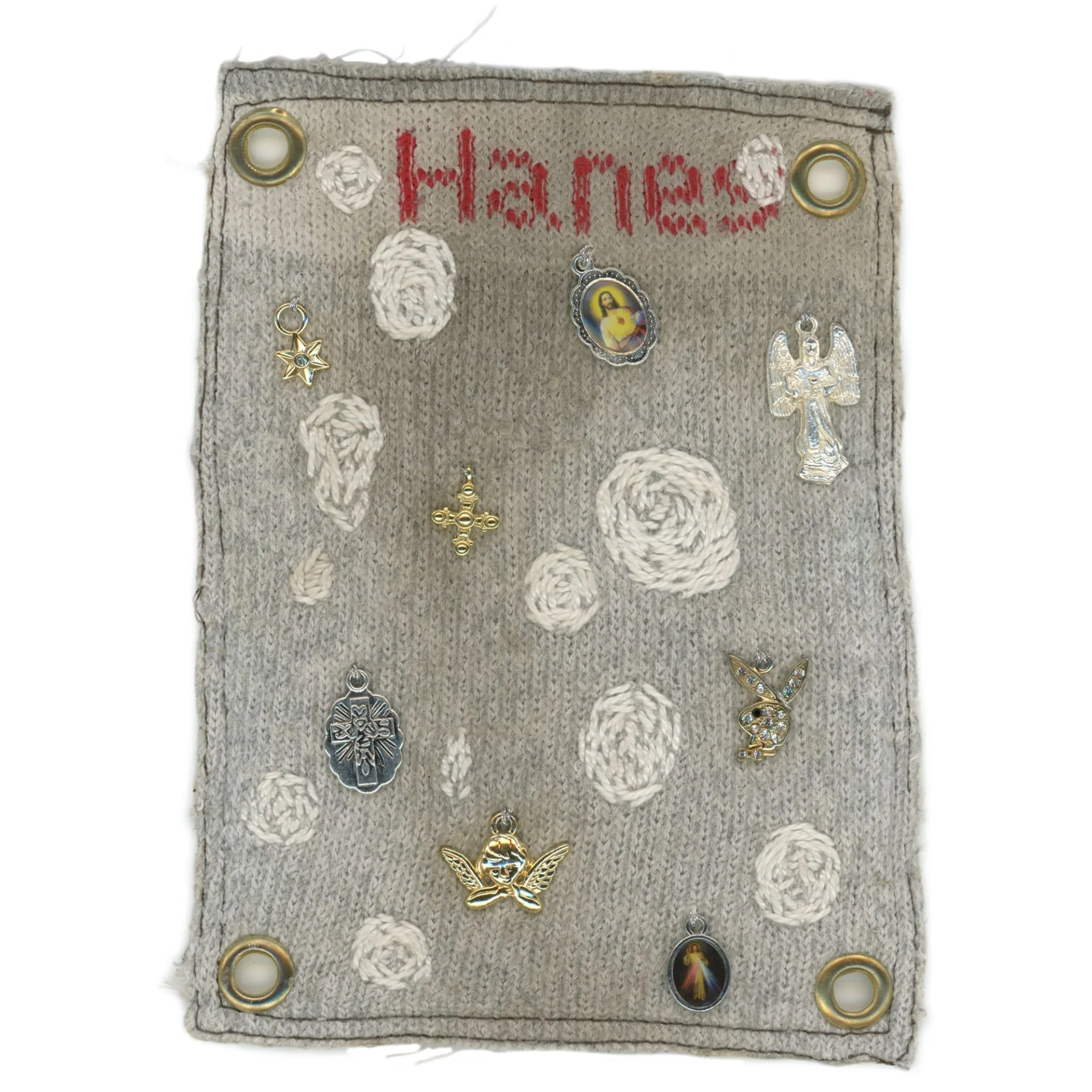 Screen print and charms on stained wood panel